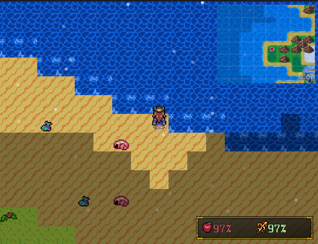 Made some progress on procedural terrain generation: now adjacent biomes blend together using perlin noise, and their procedural map will get additional features from them. Also now the generator add a coastline if the current biome borders with the ocean, water level changes according to tides and the various scattered seashells changes with each tide.