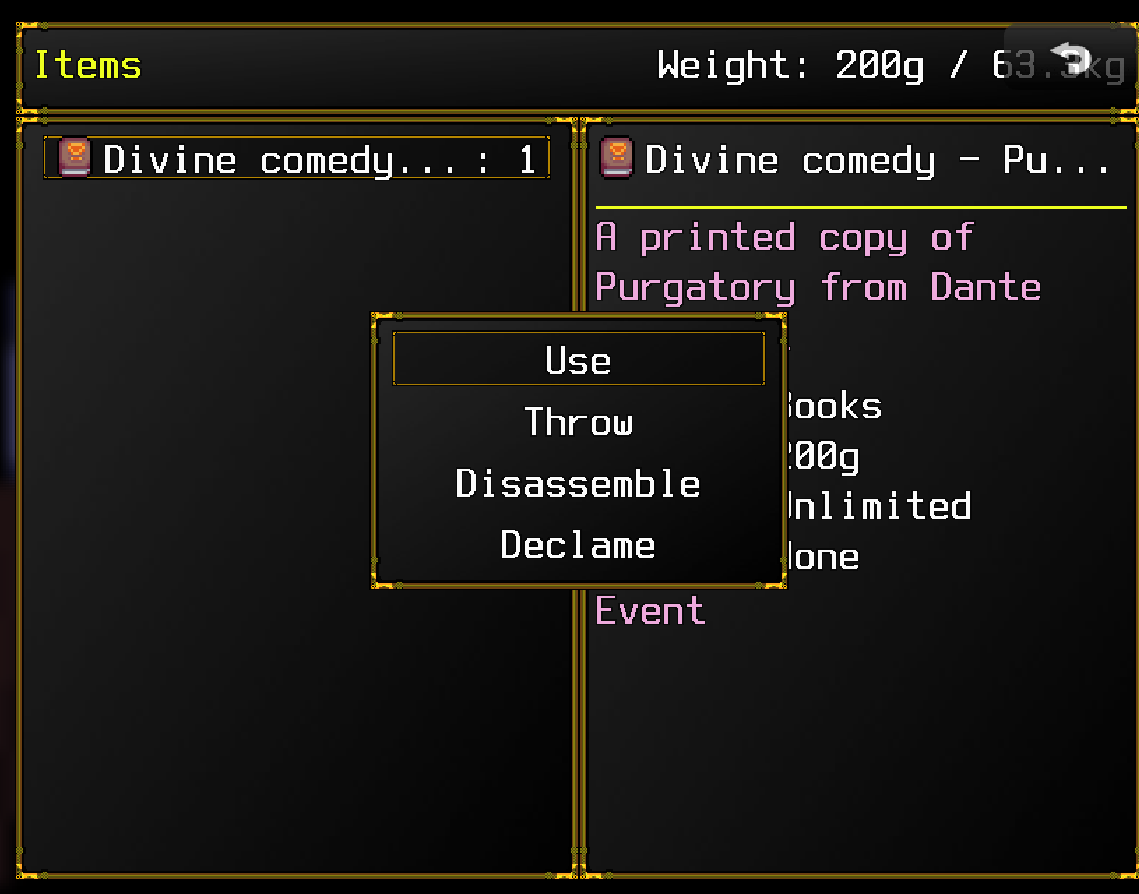 Added a context menu in inventory to add more complex item interactions: you can now disassemble, throw them and some items have multiple uses, for example you can recite passages from books you own to other people, practice instrument or play a specific song, empty a potion to the ground get a empty vial ecc...and yes you can read the entire Divine Comedy as a in-game book, along with other public domain books.