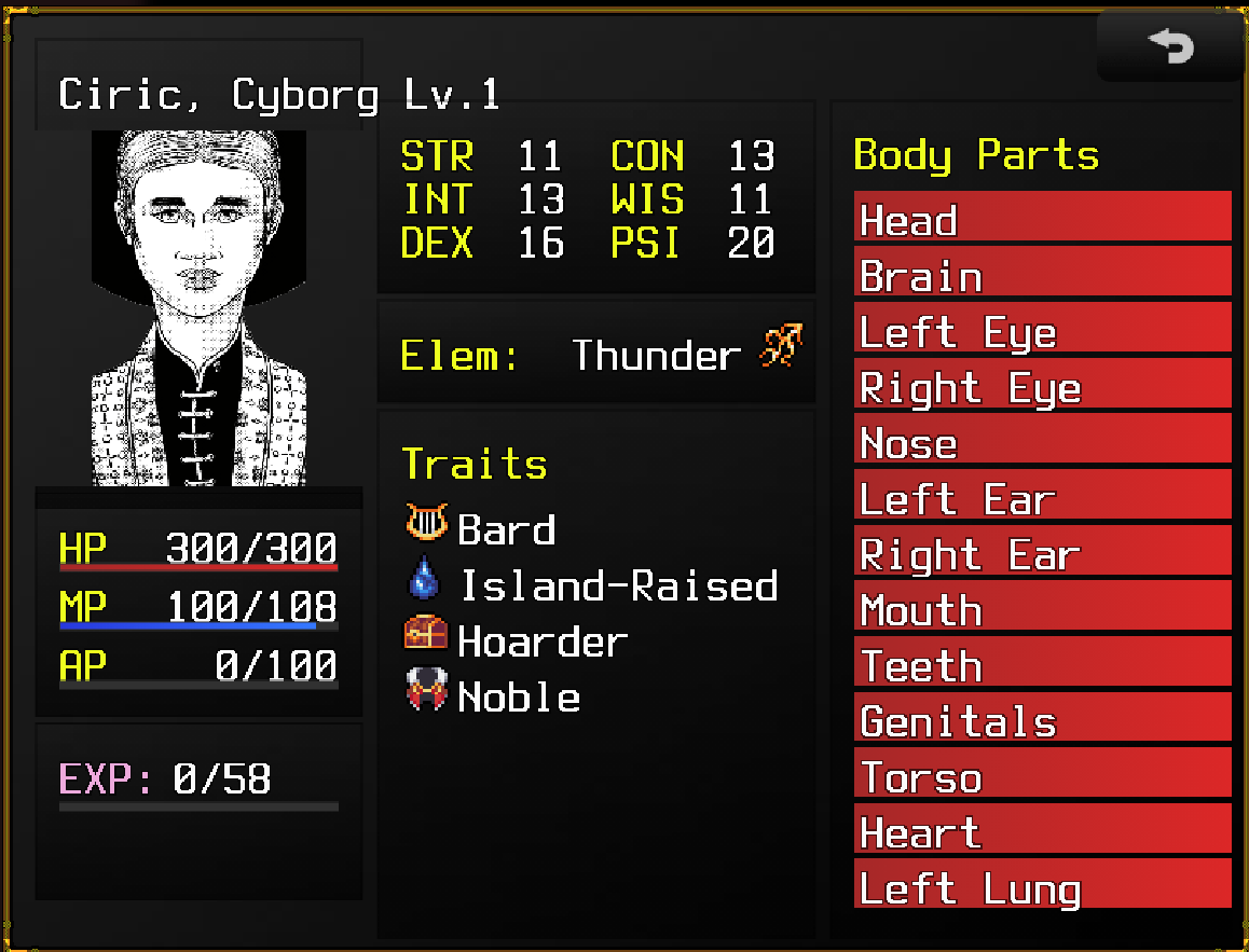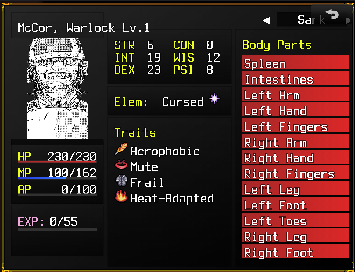 Made the character sheets more compact, showing traits, stats and the status of the various bodyparts.